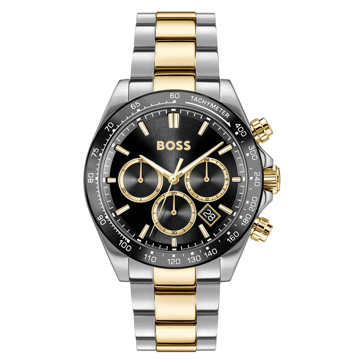Hero 2.0 Chronograph 43mm Black Dial Two Tone Steel Bracelet Men's379.00Buy!£Fraserhart.co.ukDelivery: in United Kingdom ReportA chronograph watch with a black dial, three subdials, and a date display. Gold-tone luminous hands and indexes enhance legibility against the dark dial. The 44mm stainless steel case features a black more→tachymeter bezel, paired with a two-tone stainless steel bracelet and folding clasp. Powered by a quartz movement and water resistant to 50m.