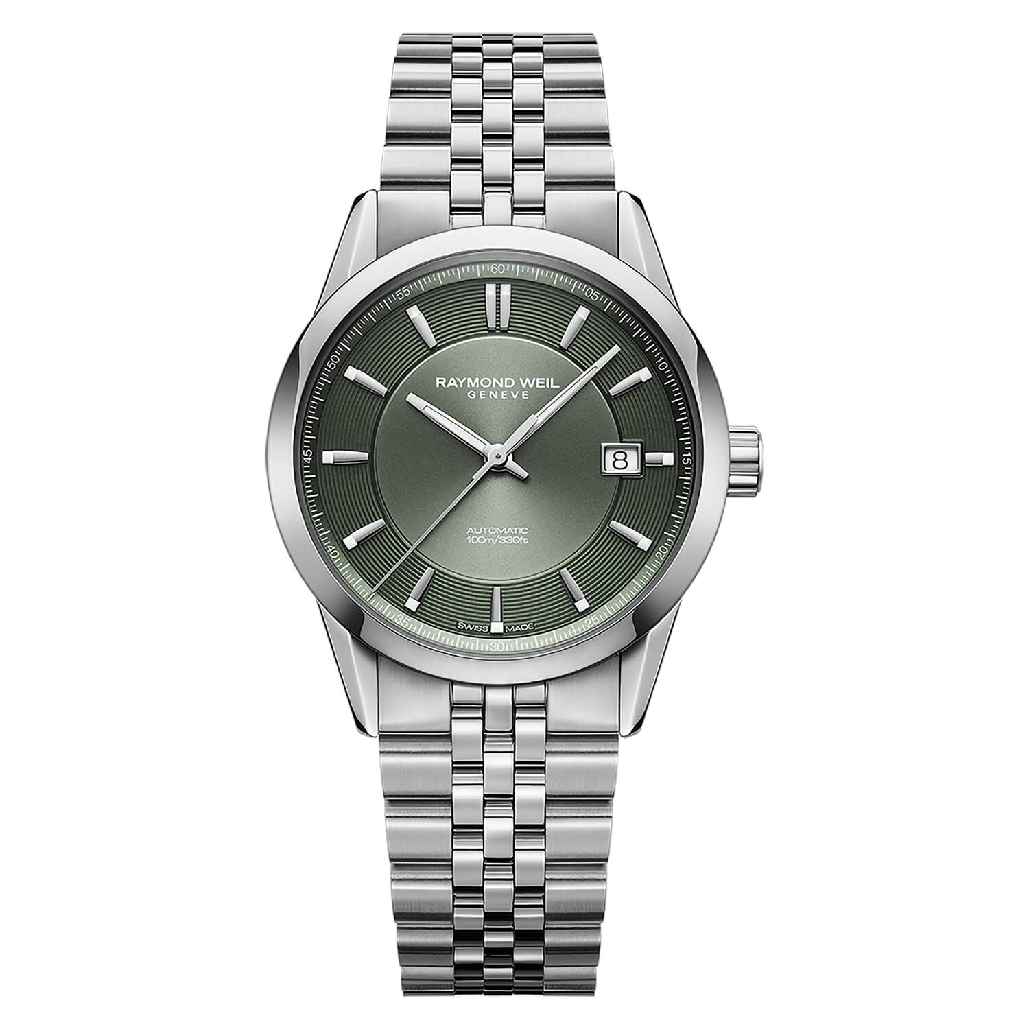 Freelancer 38mm Olive Green Dial Steel Bracelet Men's1,995.00Buy!£Fraserhart.co.ukDelivery: in United Kingdom ReportLaunched in 2007, the RAYMOND WEIL freelancer automatic collection embodies the spirit of independence with its sophisticated mechanical watches. This elegant model features a 38mm case with an automa more→tic movement visible through a sapphire crystal back, an olive green dial with a date function at 3 o’clock, and a stainless steel bracelet secured by a double-push security folding clasp. The screw-down crown is elegantly embossed with the RW monogram, blending traditional craftsmanship with modern design in a seamless, unique aesthetic.