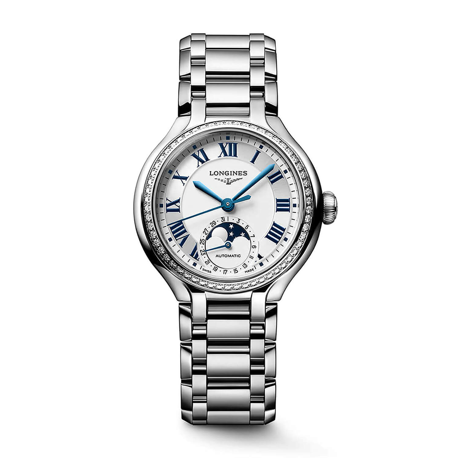 Elegance Primaluna 34mm Moonphase Silver Dial Diamond Bezel Steel Bracelet Ladies5,050.00Buy!£Fraserhart.co.ukDelivery: in United Kingdom ReportA luxurious expression of the Master Collection, this 34mm model features a sunray silver dial with blue painted Roman numerals, blued steel hands, and a moonphase display with calendar at 6 o’clock. more→The stainless steel case is set with 58 Top Wesselton diamonds (0.58 ct) and fitted with sapphire crystal and transparent case back. Inside, the Longines calibre L899.5 automatic movement delivers a 72-hour power reserve, silicon balance-spring, and anti-magnetic protection. Finished with a stainless steel bracelet and folding clasp, this watch is water resistant to 30m.Please note this item is not available for international shipping outside of UK.