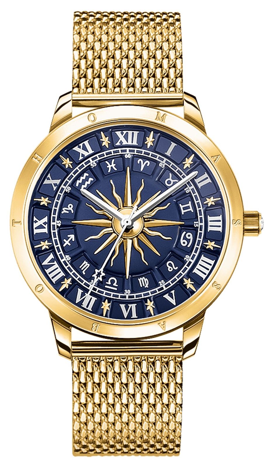 Sabo THOMAS Gold Plated Stainless Steel Cosmic Amulet Watch WA0403-264-207-33 MMfrom £475.00 up to £479.00 Compare prices2→Adorned with cosmic symbols of the moon, stars, the sun, an eye and a heart, this watch exudes a sense of mystical charm. Hand-painted in rich hues of red, blue and purple enamel, and meticulously han more→dset with sparkling cubic zirconia stones, the dial is