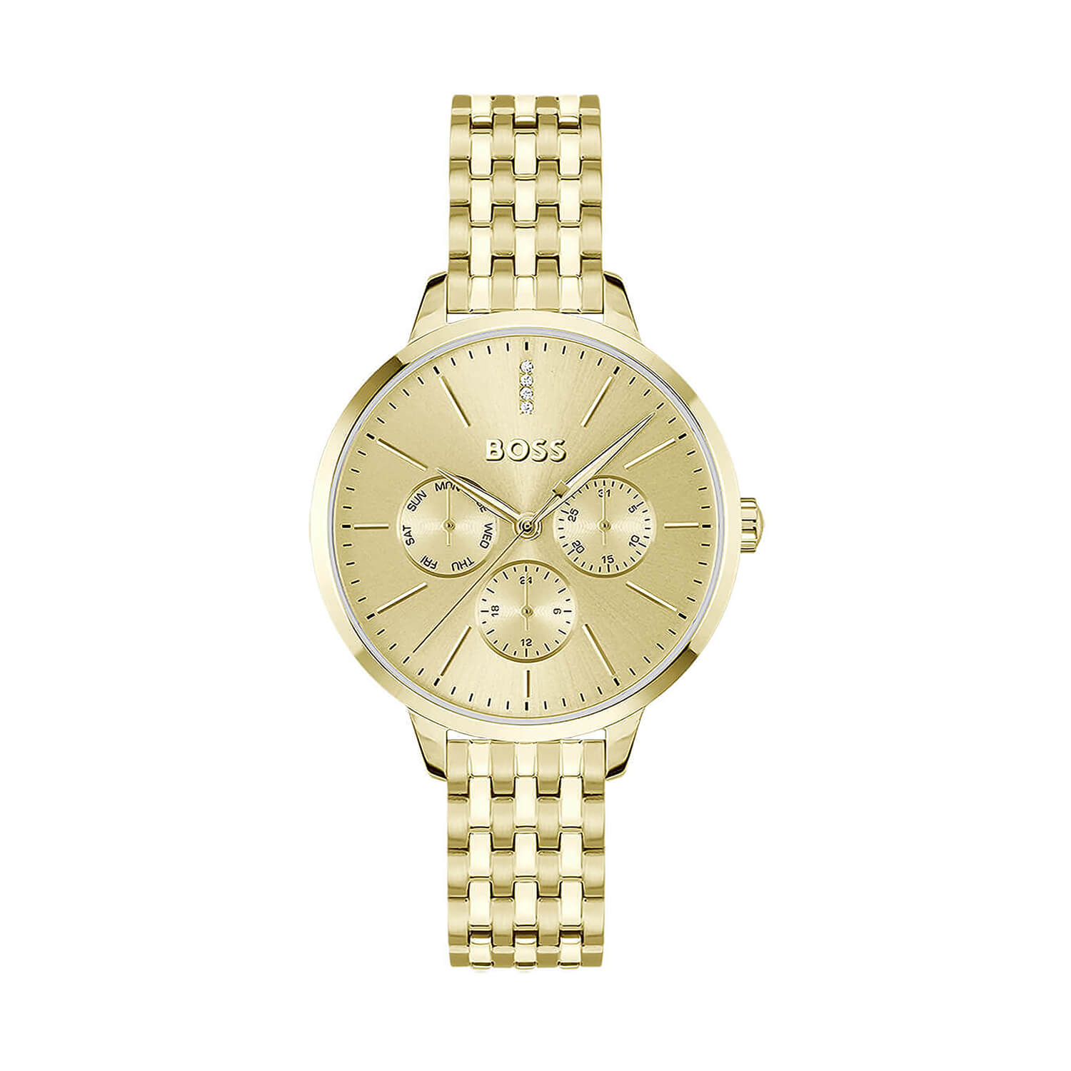 Symphony 38mm Gold Crystal Studded Dial Stainless Steel Bracelet Ladies229.00Buy!£Fraserhart.co.ukDelivery: in United Kingdom ReportThis BOSS watch combines classic and modern elements, featuring twinkling crystals forming the 12 o'clock marker. The slender gold-tone seven-link bracelet adds a refined touch, making it an elegant a more→ccessory for any occasion.