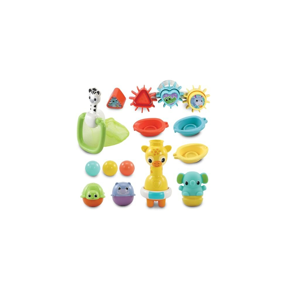 Vtech 6-In-1 Bath Set24.99Buy!£Hamleys.comDelivery: to United Kingdom ReportBundles of fun with this 6-in-1 bath set, pour water into giraffe and watch the water come out of his ring, one rubbery animal squirter adds squirting fun to any bath, the squirter can be taken apart more→and put back together to make cleaning and drying easy, two animal cups for scooping and pouring, the stackable, linking boats have numbers on them and are brightly coloured to support number and colour recognition, shape blocks and gears are great for small hands to problem solve and explore shapes, use the bath net to scoop the balls up and when bath time is over stick zebra and his net to the wall and store all your bath time fun set