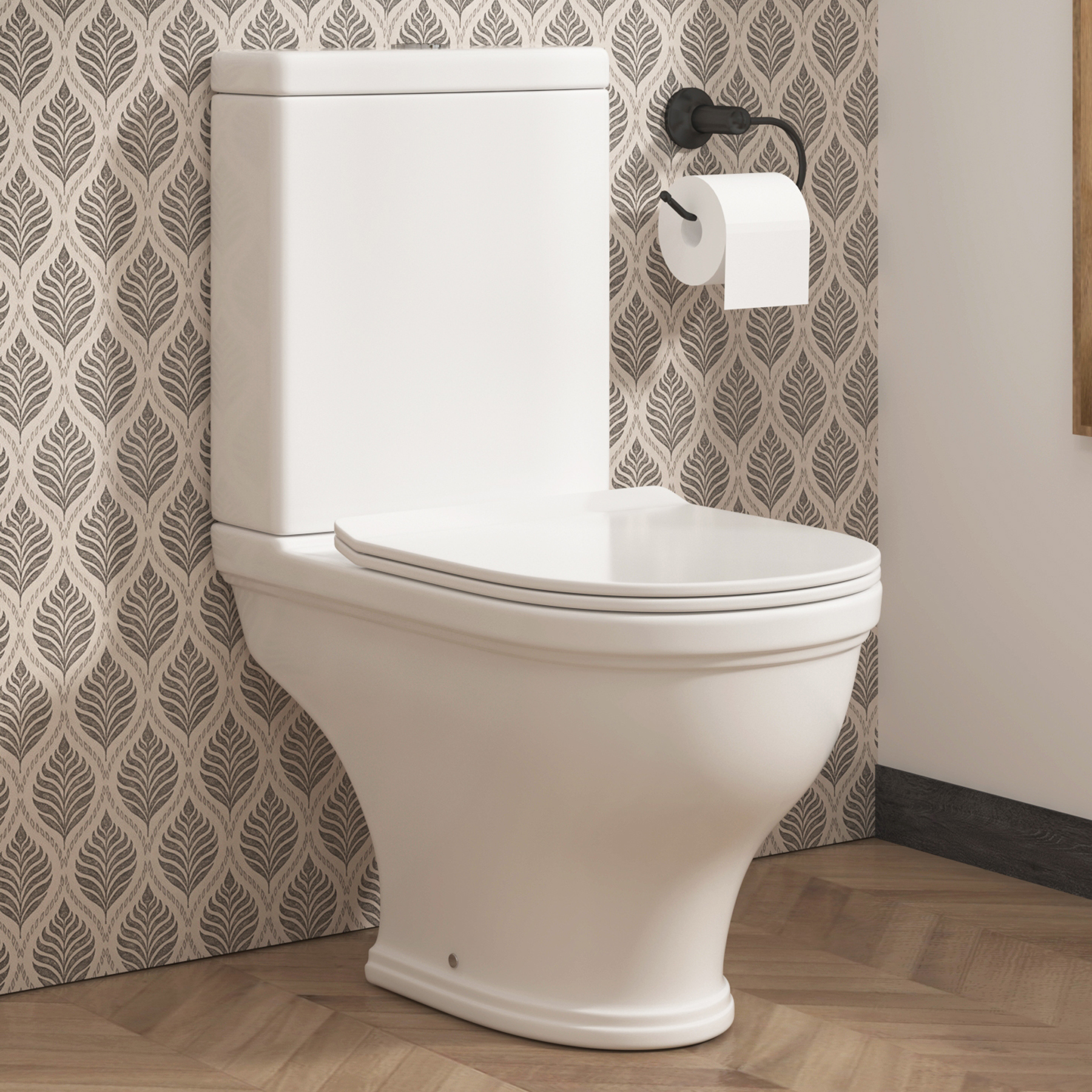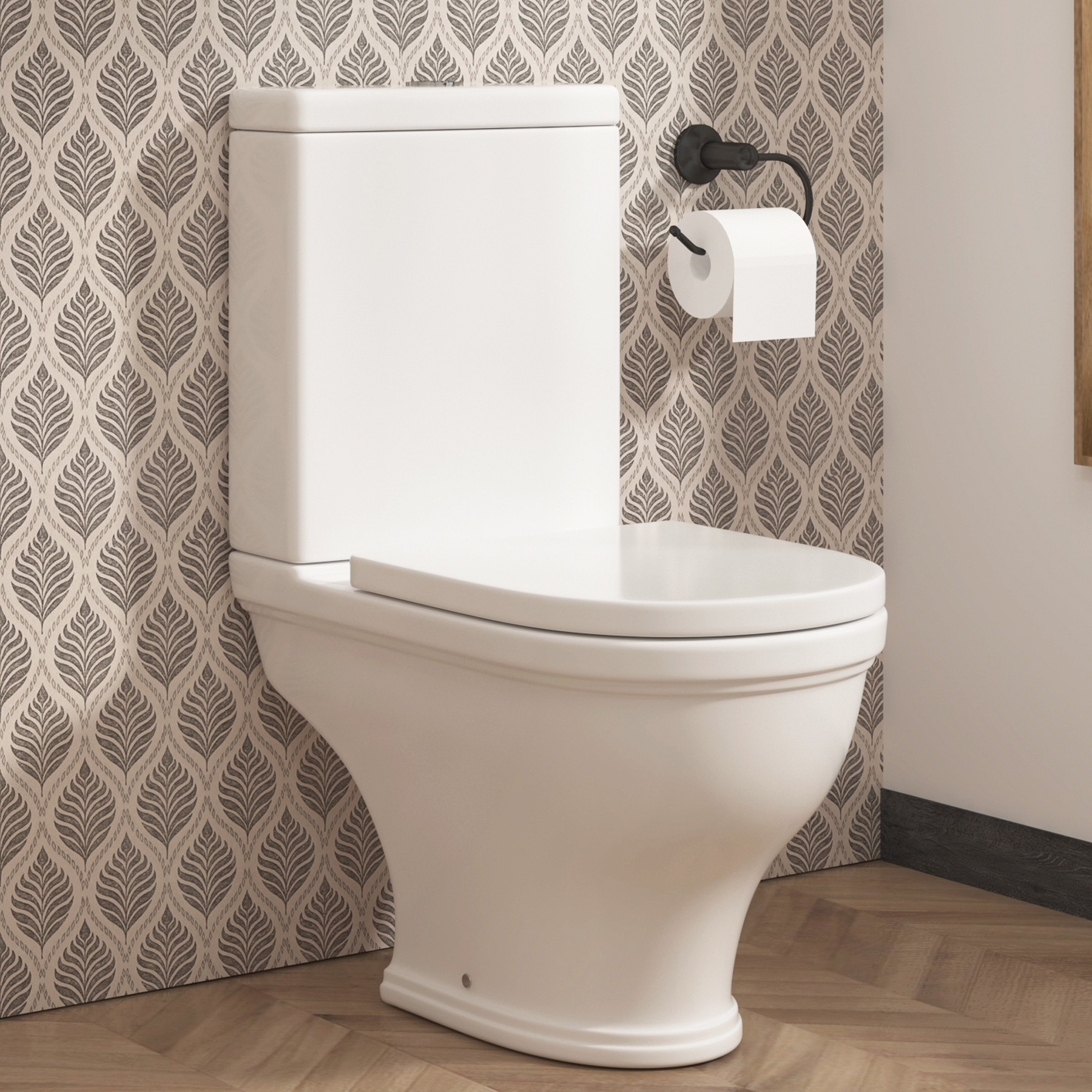 Close Coupled Rimless Toilet with Soft Close Seat and Matt Black Fittings - Ripley BUN/RIPCCPAN/98120249.97Buy!£AppliancesDirect.co.ukDelivery: in United Kingdom Report. Features we love Traditional Close Coupled. . Toilet . With an integrated cistern and pan design which brings period charm and modern functionality to your bathroom. Soft-Close Mechanism With Quic more→k Release Seat . The soft-close seat ensures a quiet and smooth experience while the quick-release function allows for easy removal cleaning and re-installation. Wooden Toilet Seat With Black Hinges . Offering a sturdy warmer alternative to plastic – ideal for comfort and long-term use. Matching matt black soft-close seat hinges for coordinated detailing. 4/6 Litre Dual Flush Feature . Allows you to conserve water without compromising performance the push button is finished in matt