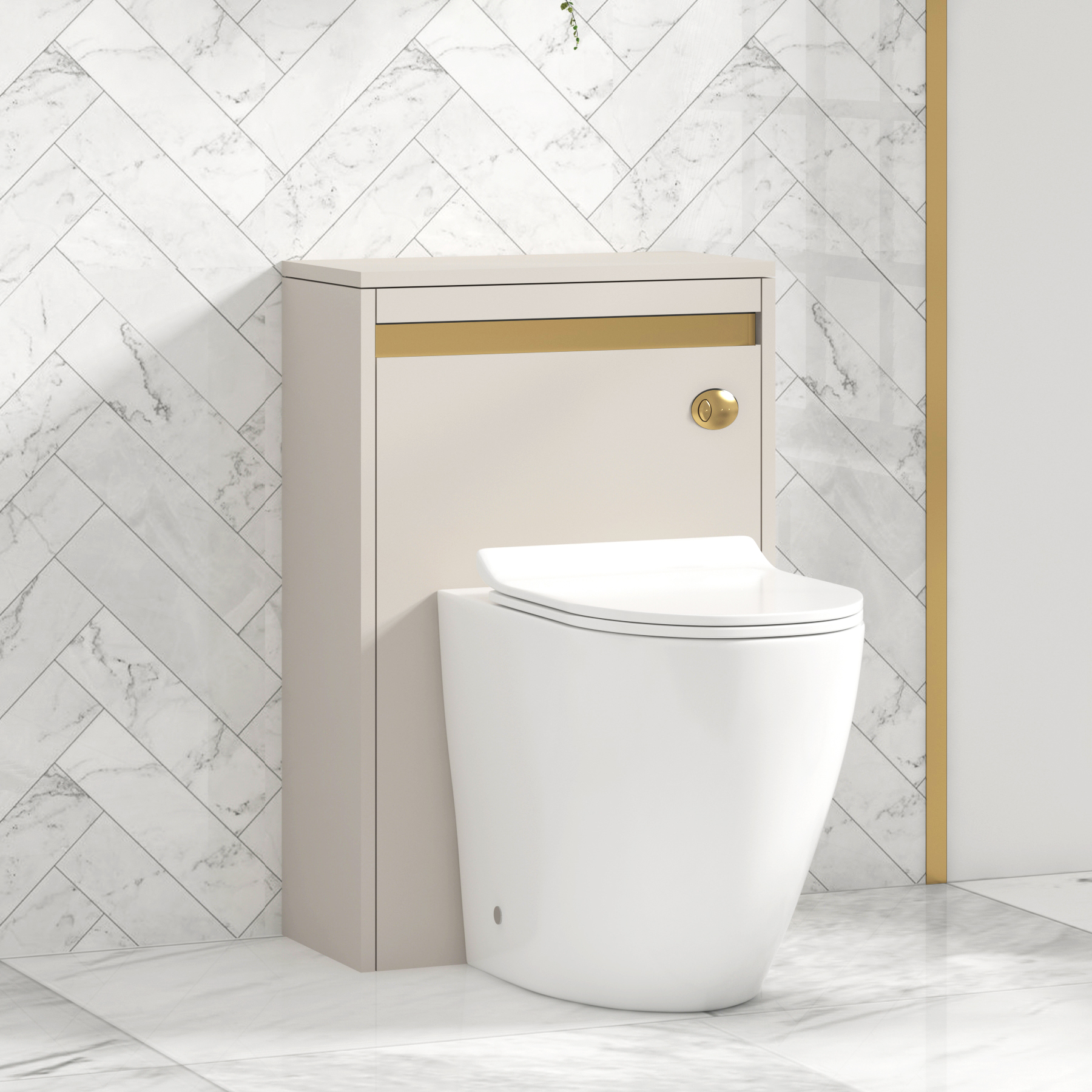 Orion 540mm Warm Taupe BTW WC Unit with Cesar Rimless Toilet Pan & Slim Seat, Cistern | Brushed Brass Accent Trim LX741GH-BT319.99Buy!£Royalbathrooms.co.ukDelivery: to United Kingdom ReportOrion 540mm Warm Taupe Bathroom WC and Back-to-Wall Toilet Unit with Slim Seat, Concealed Cistern | Brushed Brass Accent Trim Orion WC unit is specifically crafted for back-to-wall toilets, providing more→a seamless integrated look. Much more than just a functional piece, it combines a luxurious finish, space efficient design and practical features making it a standout choice for modern bathrooms. Perfect to pair with a variety of modern back-to-wall toilet bowls, it's a versatile choice for a wide range of bathroom styles. This back-to-wall toilet and cistern unit set comes complete with 5-Years Exceptional Guarantee. Water Closet (WC) Unit Warm Taupe Finish Colour Co-ordinate with a Warm Taupe