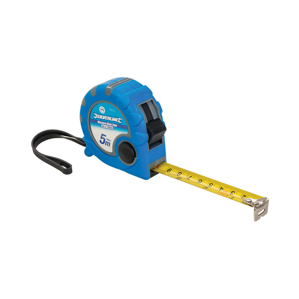 Silverline Measure Mate Tape 5m / 16ft x 19mm - measure tape mate 5m 19mm x 868770from £6.09Compare prices2→Rugged rubber-grip case, blade-lock, brake and auto return Double-riveted tip with wraparound reinforcement Durable, coated blade Measures both...