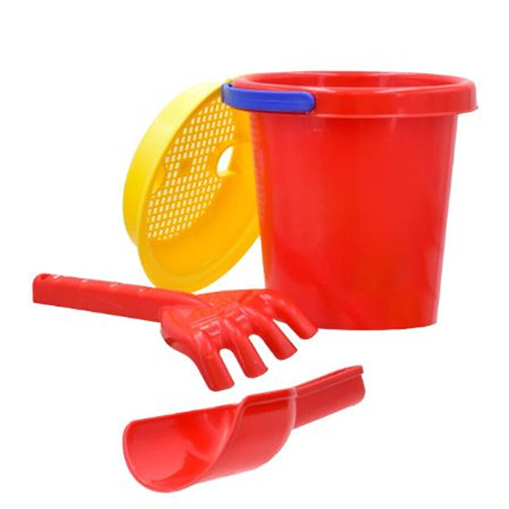 Red Beach Bucket Set With Sieve, Rake & Spade 6" TY7471from £3.99 up to £100.74 Compare prices2→Bucket height approx 6". Complete with sand sieve, rake & spade.