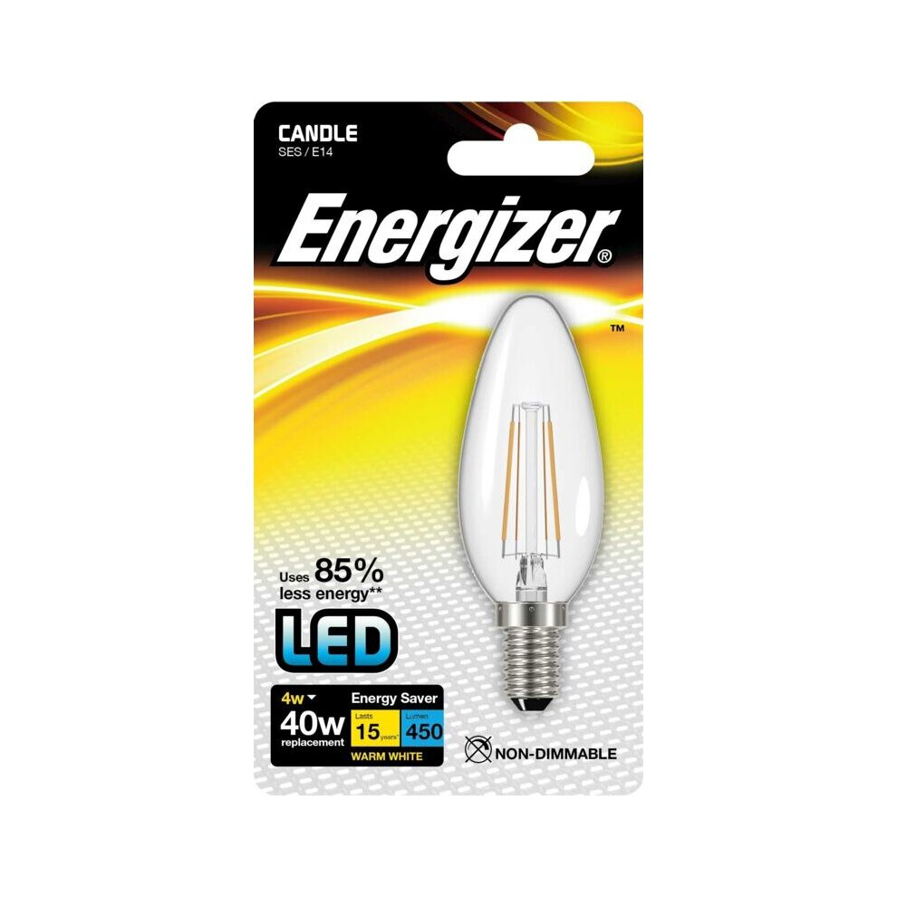 Energizer Filament LED Candle Bulb 470lm E14 Warm White SES 4w S9030 [S9030]4wPrice from £6.29 up to £6.75 Compare prices and buy Energizer Filament LED Candle Bulb 470lm E14 Warm White SES 4w S9030 [S9030]Amazon.co.uk (United Kingdom) →£6.00Onbuy.com (United Kingdom) →£7.00Compare prices2→