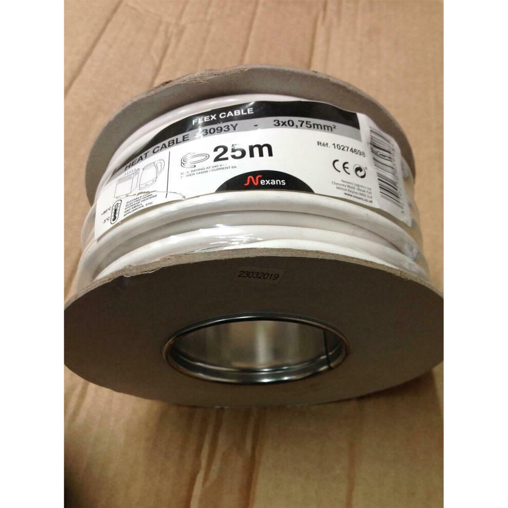 Nexans Heat Resistant Cable 3095Y 3-Core 25m reel (0.75mm)Product Description: Suitable for: Electrical Hobs Storage heaters & small appliances Max rating at 240v Power: 1440w Current: 6A Length: 25m... £15.50OnBuy.comDelivery: in United Kingdom ReportBuy!
