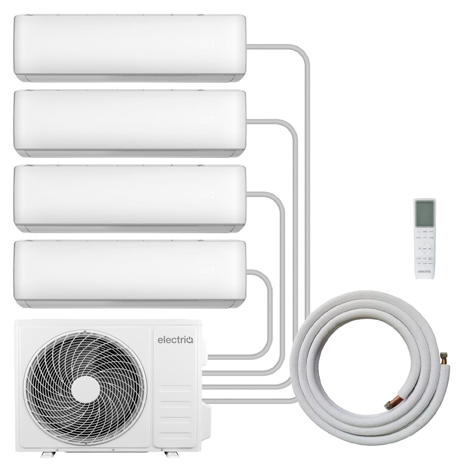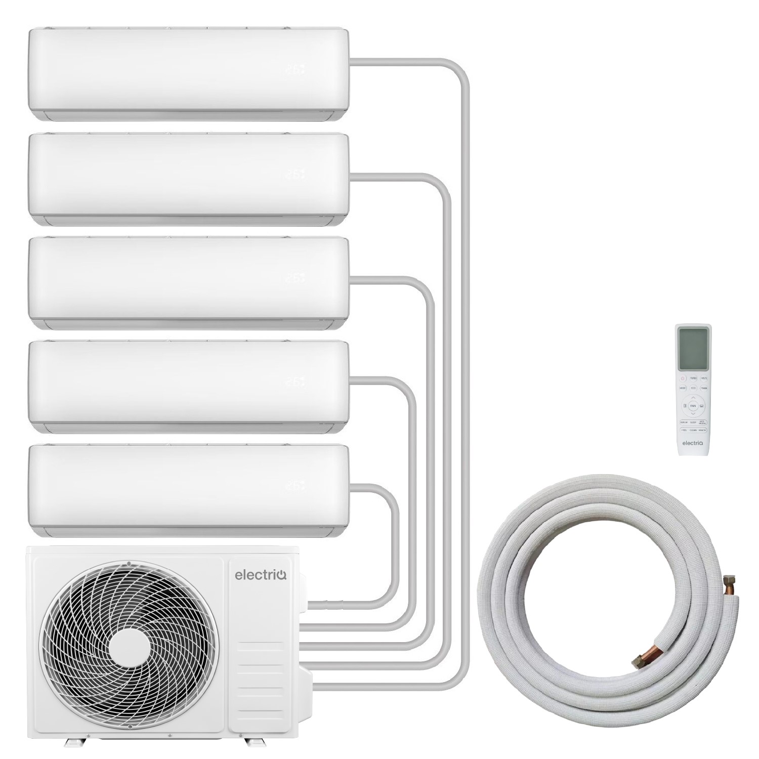 electriQ iQool Multi-Split 5 x 12000 BTU Smart Wall Mounted Split Air Conditioner with Heat Pump - Pipe Kits Included IQool-. These units contain a gas which is governed by F-Gas regulations. The gas must be handled by a qualified F-Gas personnel. 2 Year warranty is subject to commissioning by qualified F-Gas engineers. 5 Years extended parts warranty is subject to annual service. Further information on the requirements and ensuring the engineer is qualified can be found at gov.uk . . A space-saving solutionUnlike conventional split air conditioners that require a separate outdoor compressor unit for every room this advanced multi-split air conditioner system is designed to power . five rooms. from a . single outdoor compressor. This saves on expensive installation and running costs and keeps the outside of … £2,499.98AppliancesDirect.co.ukDelivery: in United Kingdom ReportBuy!