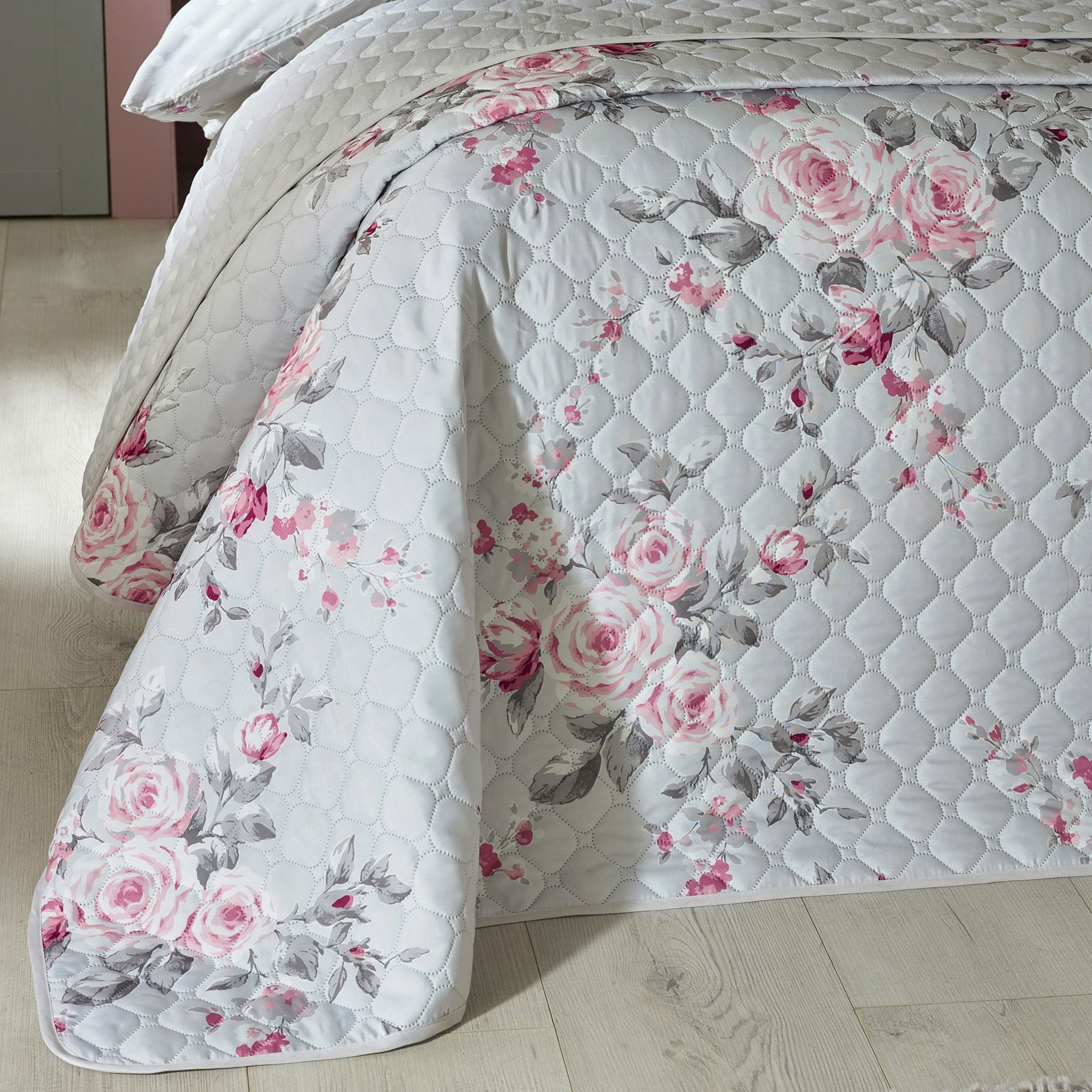 Catherine Lansfield Rackhams Canterbury Floral Reversible Quilted Bedspread - 240 x 260 cm - Grey - 100 Polyesterfrom £31.20 up to £50.00 Compare prices5→Add the finishing touch with this contemporary twist on a classic design Perfectly placed florals create a fabulous and fantastic statement piece with a cute polka dot reverse this can transform the more→look but keep the trend with a "flip" of your bedspread