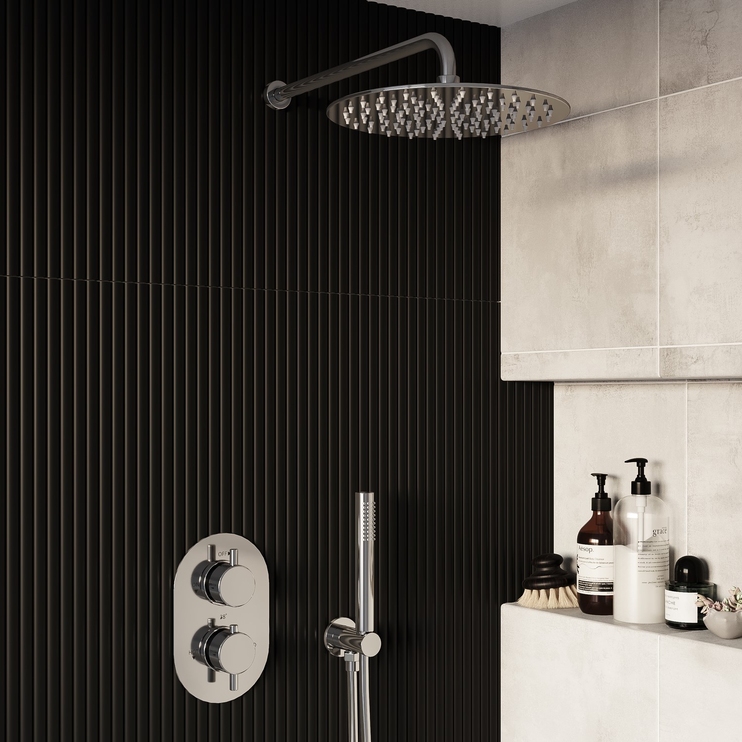 Chrome 2 Outlet Wall Mounted Thermostatic Mixer Shower Set With Hand Shower - Arissa Chrome BUN/BeBa26810/95428129.97Buy!£BetterBathrooms.comDelivery: in United Kingdom ReportAll about me . This Flow shower bundle in polished chrome is the perfect fit for a modern minimalist bathroom recessed for a streamlined look.This pack includes overhead shower with 300mm wall mounted more→head 2 outlet valve and shower hose with bracket.It is manufactured to an exceptional finish and designed for a sophisticated look. It incorporates a modern design and the highest quality brass for a highly reliable operation. With a modern polished chrome finish this shower will suit most of our products to help you build your ideal suite. The electroplated finish strengthens the shower's resistance to rust and corrosion boosting longevity and enduranceNeed to know - Valve . Dimensions .