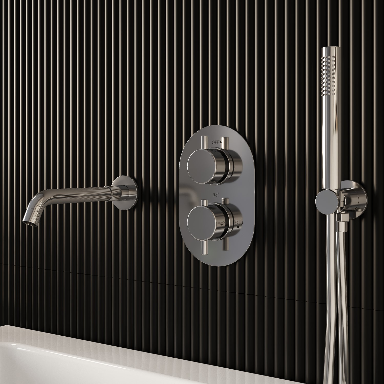 Chrome 2 Outlet Wall Mounted Thermostatic Mixer Shower Set With Hand Shower & Spout - Flow Chrome BUN/BeBa27755/96381159.97Buy!£BetterBathrooms.comDelivery: in United Kingdom ReportAll about meThe Flow Round shower bundle in polished chrome is the perfect fit for a modern minimalist bathroom recessed for a streamlined look.This pack includes 2 outlet valve with shower hose and s more→pout bath filler. This is perfect for use with your freestanding bath.It is manufactured to an exceptional finish and designed for a sophisticated look. It incorporates a modern design and the highest quality brass for a highly reliable operation. With a modern chrome finish this shower will suit most of our products to help you build your ideal suite. The electroplated finish strengthens the shower's resistance to rust and corrosion boosting longevity and endurance. Need to know - valve .