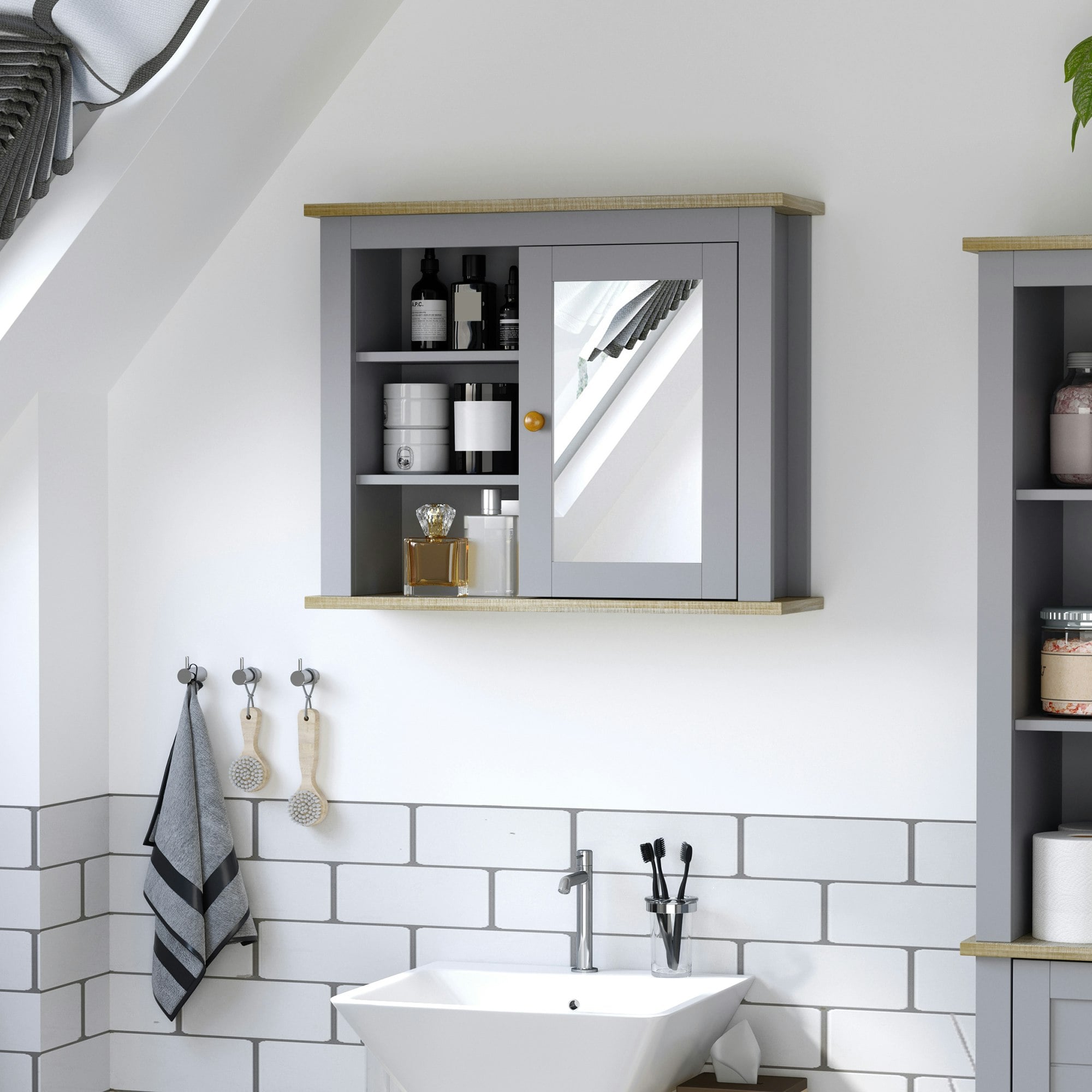 Kleankin Rackhams Bathroom Mirror Cabinet Storage Organizer with Open Inside Shelves - Greyfrom £20.00 up to £36.00 Compare prices4→The kleankin bathroom mirror cabinet combines a mirrored door with practical shelving to keep everyday essentials organised. Designed for wall mounting, it features a slightly boxy shape and a mid-gre more→y tone for a distinctive look in the bathroom. Storage is split between a main mirrored cabinet for more discreet items and three side shelves for easy-access essentials. A flat top panel provides additional space for placing small items, helping you make the most of your wall space in moisture-filled environments. Key features On-wall bathroom storage cabinet with mirrored door Main mirrored cabinet for discreet storage Three side shelves for open storage Flat top panel for extra holding …