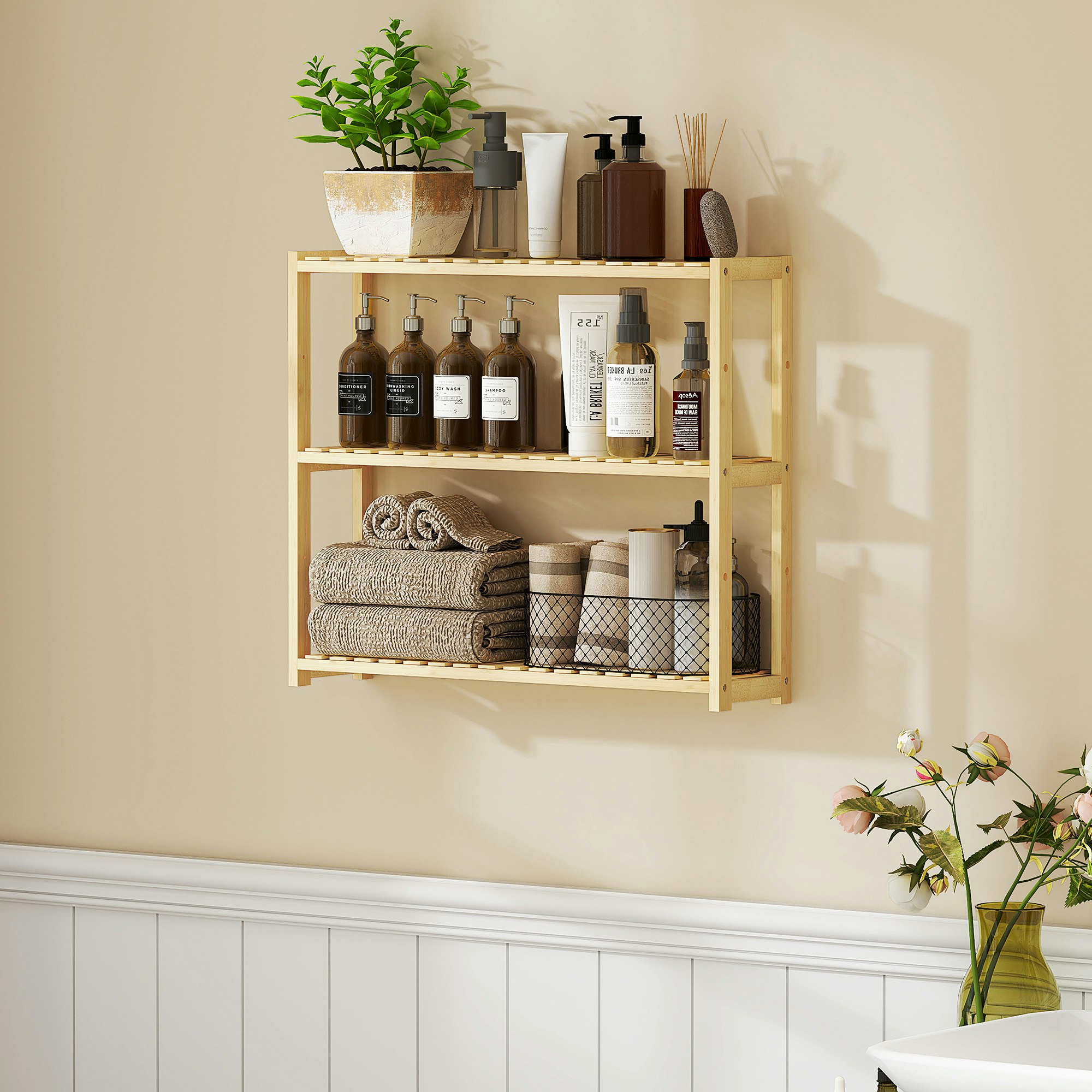 HOMCOM Rackhams 3-Tier Bamboo Adjustable Bathroom Storage Shelf, NaturalThe HOMCOM 3-tier bathroom storage shelf brings natural style and practical organisation to your bathroom. Designed for everyday storage, it offers flexible placement and adaptable shelving to suit a range of items. Crafted from 100% bamboo, this unit is finished with a waterproof coating and described as moisture resistant. It features three shelves, each adjustable across five positions, making it easy to accommodate both smaller and larger essentials. Supplied with mounting accessories, it can be used freestanding or attached to the wall depending on your space and preference. Key features Wall-mounted or freestanding design Material: 100% bamboo Waterproof coating Moisture resistant design …Price from £22.99Compare prices and buy HOMCOM Rackhams 3-Tier Bamboo Adjustable Bathroom Storage Shelf, Natural Onbuy.com (United Kingdom) →£23.00Rackhams.com (United Kingdom) →£23.00Compare prices2→