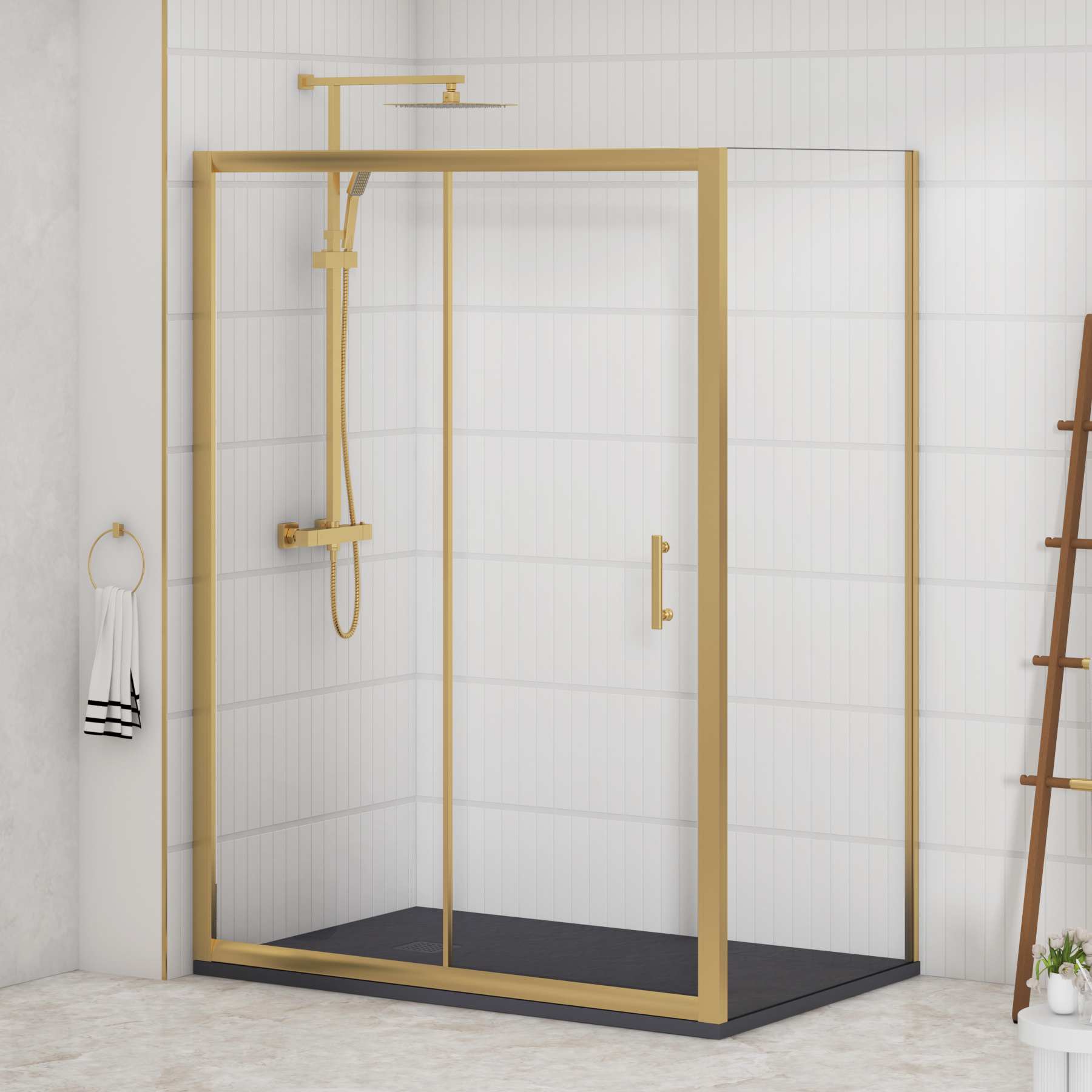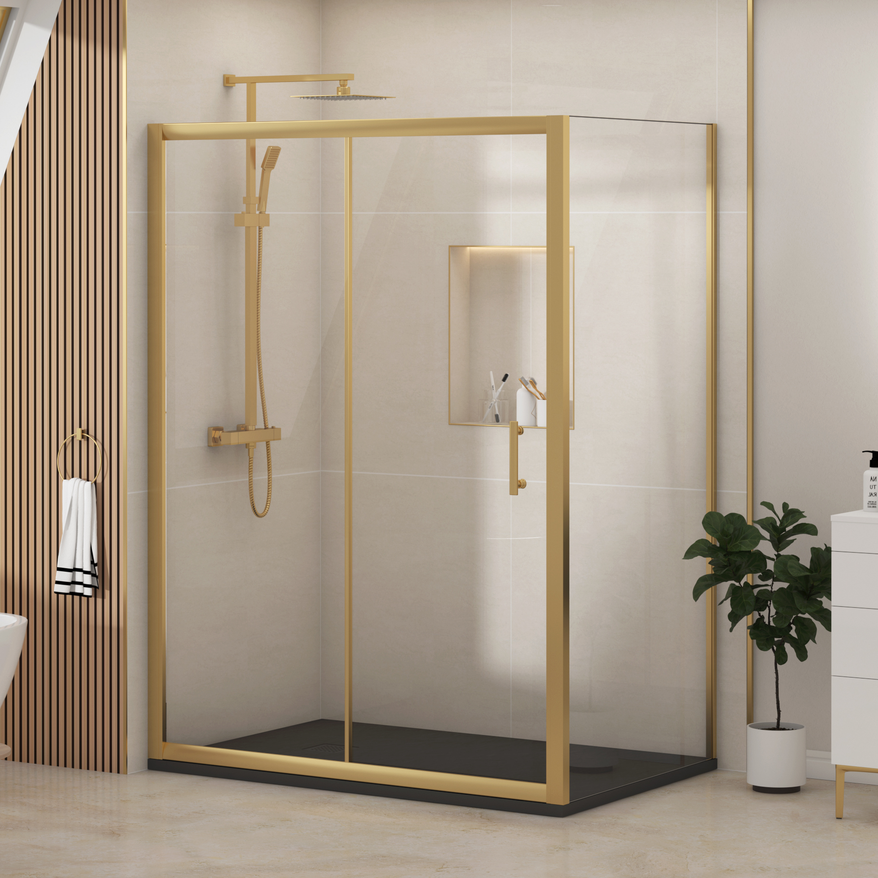 Venice Brushed Brass Sliding Door Shower Enclosure with Side Panel & Black Slate Effect Stone Shower Tray - 6mm Glass EGSD-GVenice Brushed Brass Sliding Door Shower Enclosure with Side Panel & Black Slate Effect Stone Shower Tray - 6mm Safety Tempered Glass Reversible Screen Maximize space and efficiency with the sleek and elegant rectangular sliding shower enclosure. Standing tall at 1850mm, this rectangular enclosure is crafted with 6mm safety tempered glass, ensuring lasting durability and a secure showering experience. Designed with a semi-framed look, it features a fixed side panel and a smooth-sliding door, while the other open sides seamlessly connect to the wall from two edges creating a spacious, modern feel without bulky frames. Featuring a sleek, space-saving sliding door, it effortlessly glides open £489.99Royalbathrooms.co.ukDelivery: to United Kingdom ReportBuy!