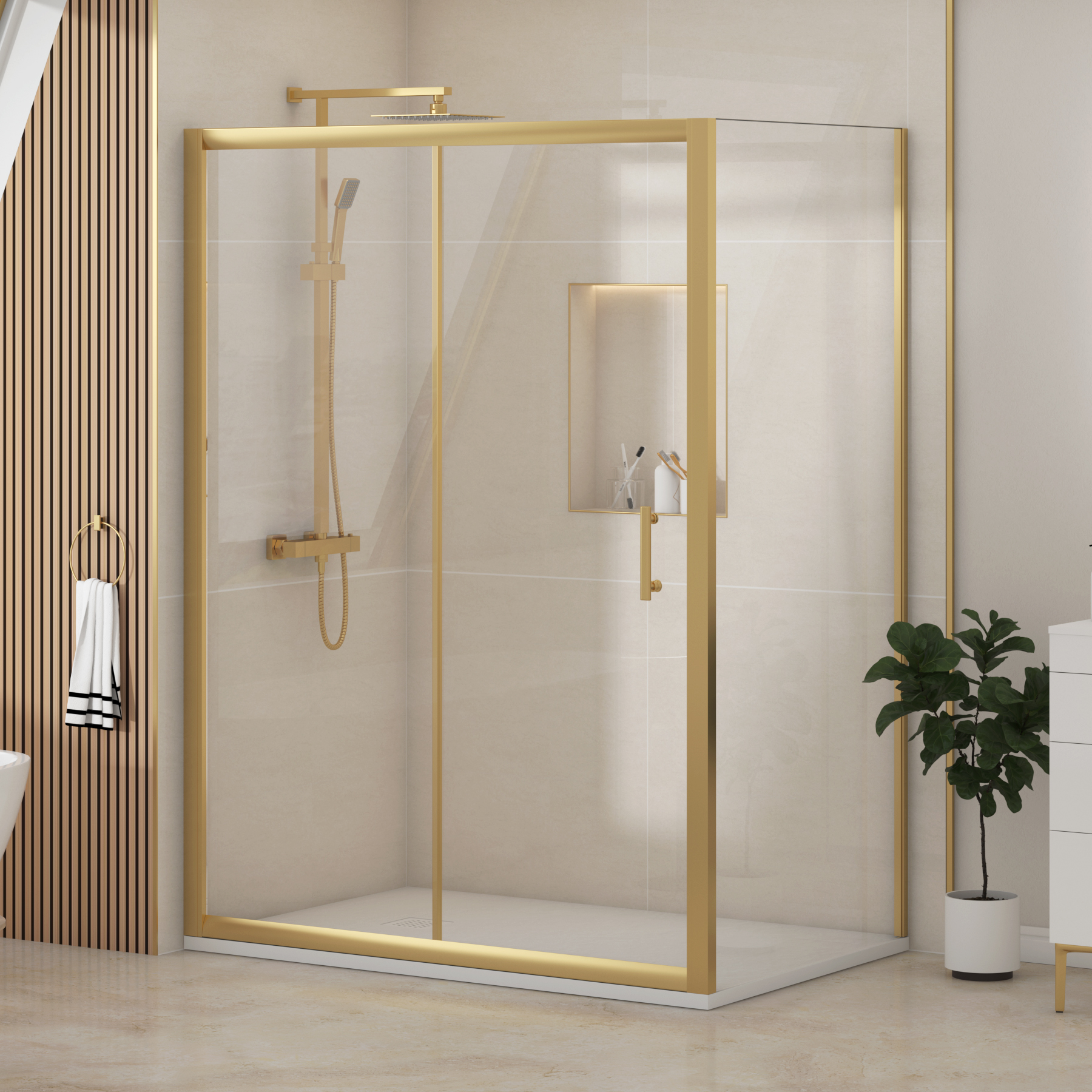 Venice Brushed Brass Sliding Door Shower Enclosure with Side Panel & White Slate Effect Stone Shower Tray - 6mm Glass EGSD-GVenice Brushed Brass Sliding Door Shower Enclosure with Side Panel & White Slate Effect Stone Shower Tray - 6mm Safety Tempered Glass Reversible Screen Maximize space and efficiency with the sleek and elegant rectangular sliding shower enclosure. Standing tall at 1850mm, this rectangular enclosure is crafted with 6mm safety tempered glass, ensuring lasting durability and a secure showering experience. Designed with a semi-framed look, it features a fixed side panel and a smooth-sliding door, while the other open sides seamlessly connect to the wall from two edges creating a spacious, modern feel without bulky frames. Featuring a sleek, space-saving sliding door, it effortlessly glides open £489.99Royalbathrooms.co.ukDelivery: to United Kingdom ReportBuy!