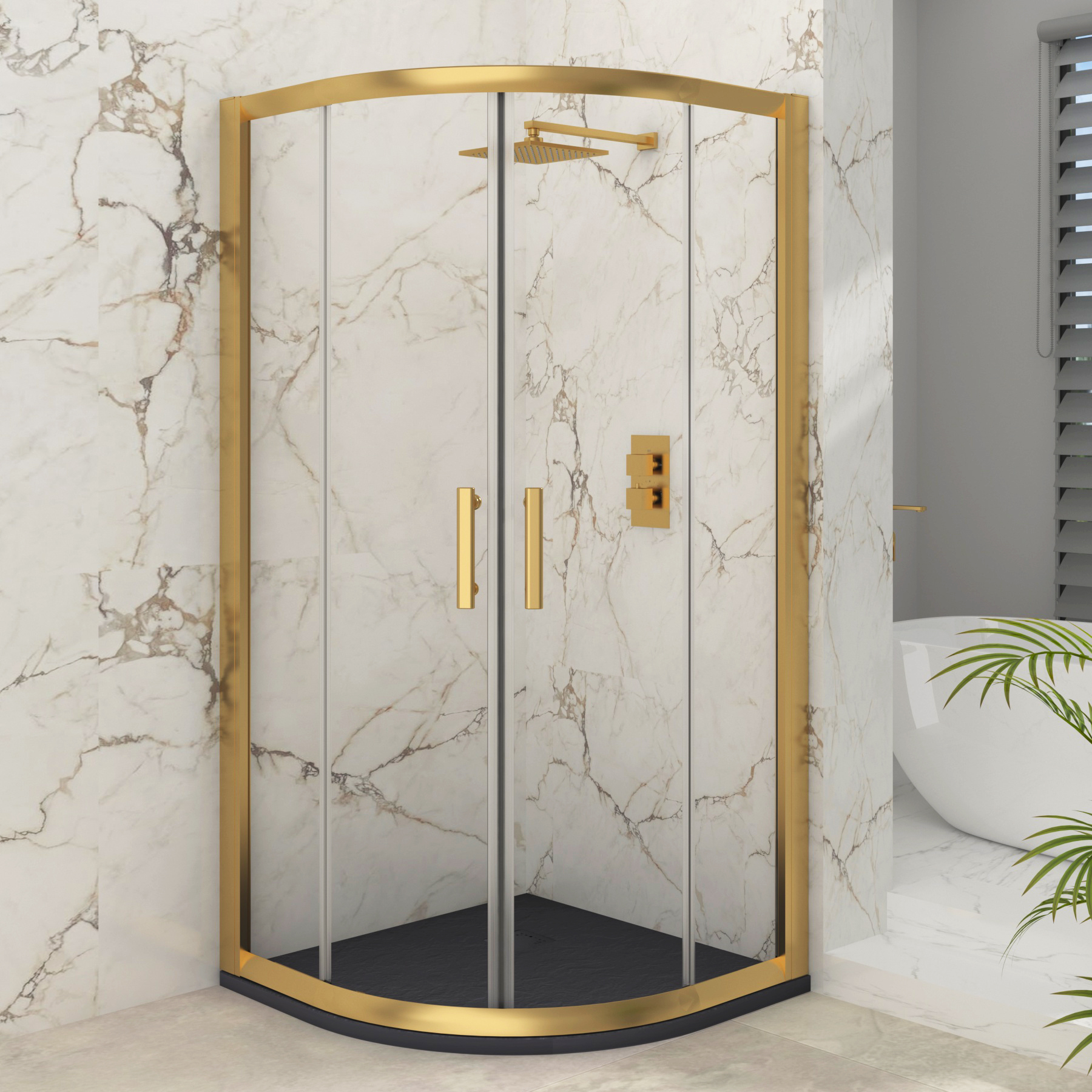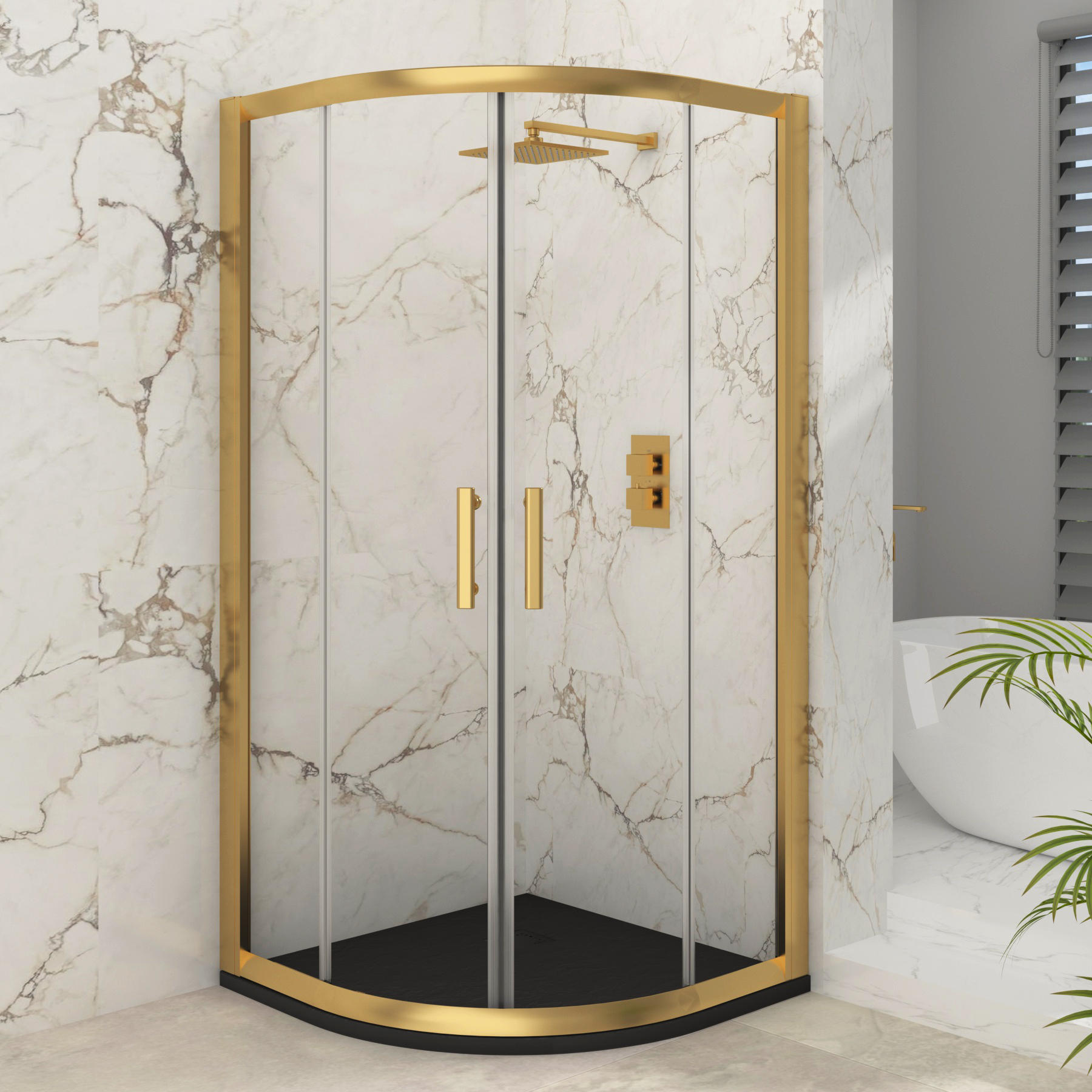 Venice 900 x 900mm Brushed Brass Quadrant Shower Enclosure with Black Stone Shower Tray - 6mm Double Sliding Door EGQ90-QST9Venice 900 x 900mm Brushed Brass Quadrant Shower Enclosure with Black Slate Effect Stone Shower Tray & Double Sliding Door 6mm Toughened Safety Glass Maximize your space and style with the sleek quadrant shower enclosure & slate effect stone tray, designed to fit seamlessly into any corner. Standing 1850mm tall, it features a double sliding door with easy-glide removable rollers for smooth and effortless operation. The 6mm safety tempered glass ensures durability while the sturdy aluminium profile with a chic brushed brass finish enhances the modern aesthetic. Its adjustable double metallic rollers keep the doors perfectly aligned and the removable design ensures easy deep cleaning. Passed £439.99Royalbathrooms.co.ukDelivery: to United Kingdom ReportBuy!