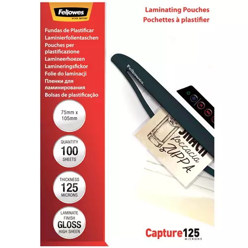 Fellowes A4 Glossy 100 Micron Laminating Pouch - 100 pack 5351111Make Your Document Last With Fellowes Premium Quality Laminating Pouches. These Gloss Finish Pouches Are Available In 80 100 125 175 And 250 Microns For All Levels Of Document Protection Making Them Ideal For Notices Photos Instructional Materials And Frequently Handled Documents. Available In Various Standard Sizes From A2 To A5. Fellowes Laminating Pouches Ensure 100% Jam Free Performance When Used With Fellowes Laminators.Price from £10.99 up to £29.21 Compare prices and buy Fellowes A4 Glossy 100 Micron Laminating Pouch - 100 pack 5351111 Onbuy.com (United Kingdom) →£11.00OnBuy.com (United Kingdom) →£13.00Onbuy.com (United Kingdom) →£13.00Tradeinn.com (United Kingdom) →£14.00RefreshCartridges.co.uk (United Kingdom) →£16.00Compare prices12→