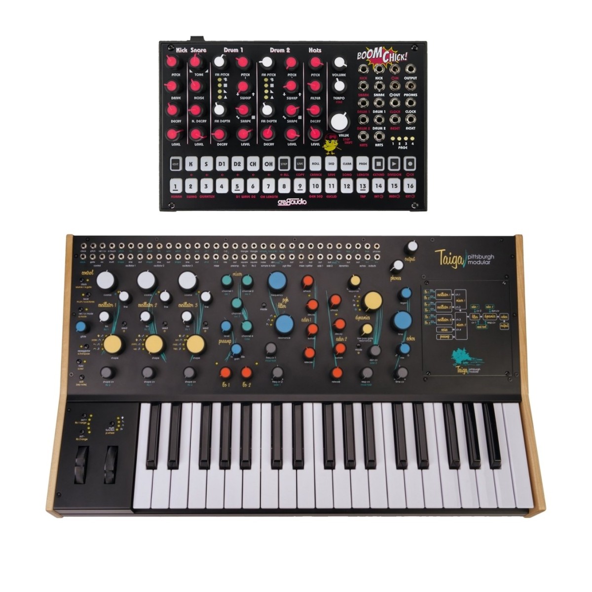 Pittsburgh Modular Taiga Keyboard with the Cre8audio Boom Chick Drum Machine Taiga Keyboard- Boom ChickThe Pittsburgh Modular Taiga Keyboard with the Cre8audio Boom Chick Drum Machine with the Cre8audio Boom Chick Drum Machine is a powerful modular synthesizer package comprised of the Pittsburgh Modular Voltage Lab 2 and the Cre8audio Boom Chick Drum Machine creating a versatile synth ecosystem for sound design and live performance. The Pittsburgh Modular Taiga Keyboard Synthesizer is an impressive addition to the world of keyboard synthesizers. Building upon the success of the Taiga synthesizer this model features full-sized keys additional modulation options and a unique modular expansion bay. It is a truly powerful and modern instrument that showcases the innovative creations of the Pennsylvania-based …Price from £1,145.00 up to £1,420.00 Compare prices and buy Pittsburgh Modular Taiga Keyboard with the Cre8audio Boom Chick Drum Machine Taiga Keyboard- Boom Chick Gear4Music.com (United Kingdom) →£1,145.00Gear4Music.com (United Kingdom) →£1,420.00Compare prices2→