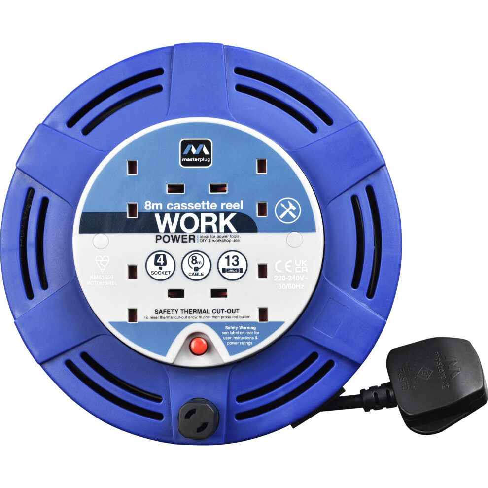 Masterplug Four Socket Cassette Reel Extension Lead, 5M, Blue 086934from £12.72Compare prices2→Supplied with 4 child resistant sockets. Cable length: 5m. 10 Amps. Safety thermal cut-out feature. UK Plug fitting.