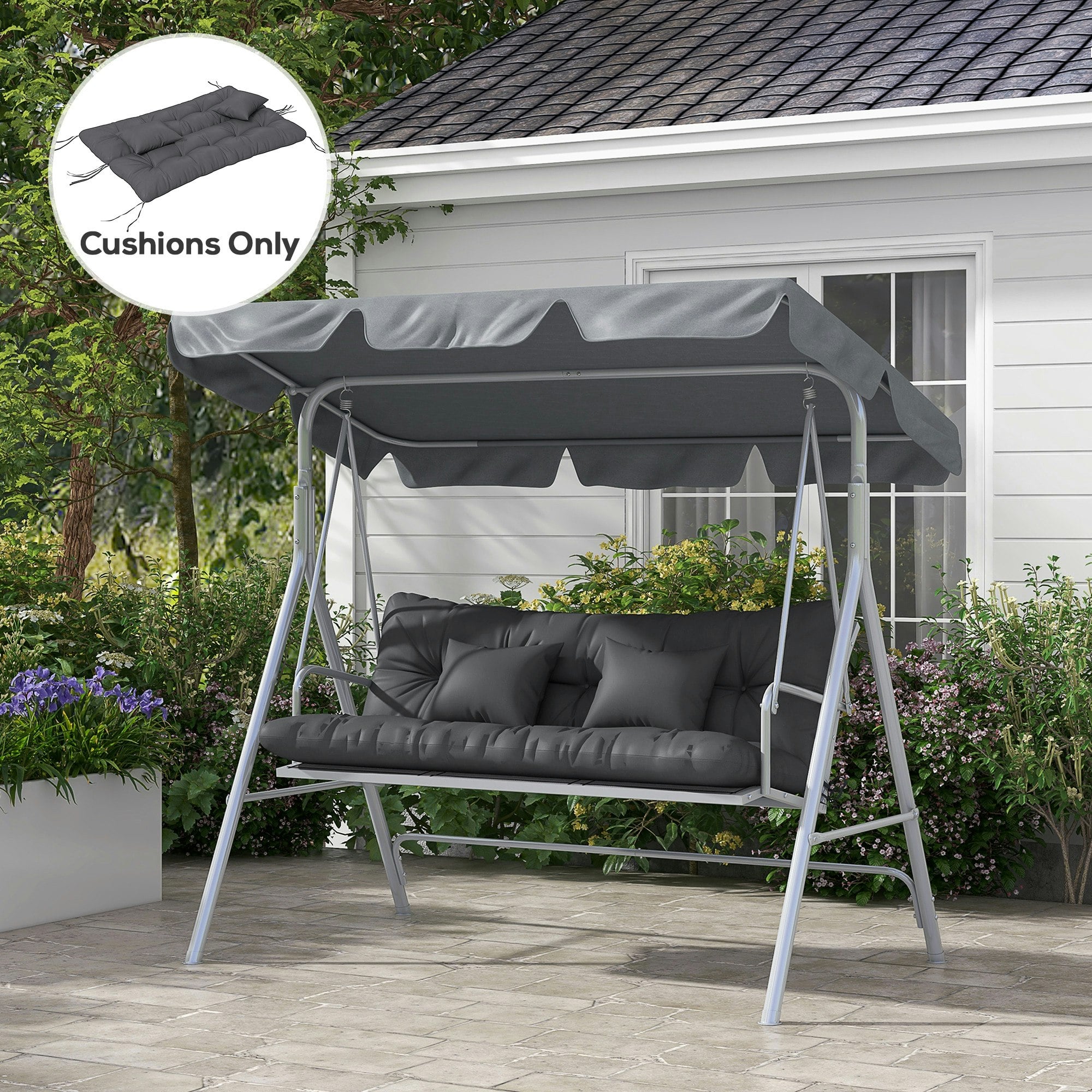 Outsunny Rackhams Outdoor Back and Seat Cushion with , NO SWING, Charcoal Grey - 150L x 50W x 10Hcm - Charcoal grey - Polyestefrom £39.10 up to £45.99 Compare prices3→Refresh your garden seating with the Outsunny outdoor back and seat cushion set, designed to add comfort to your outdoor chair. With a thick filling, each cushion helps create a more relaxing place to more→sit, whether you are enjoying a quiet moment outside or hosting friends. This set includes matching cushions and pillows, offering a simple way to update your outdoor space while keeping your seating feeling inviting. Key features Outdoor back and seat cushion set from Outsunny Thick filling for added comfort and relaxation Includes 2 x cushions and 2 x pillows Charcoal grey colour No swing Please note: Colours may appear slightly different in person than on your screen.