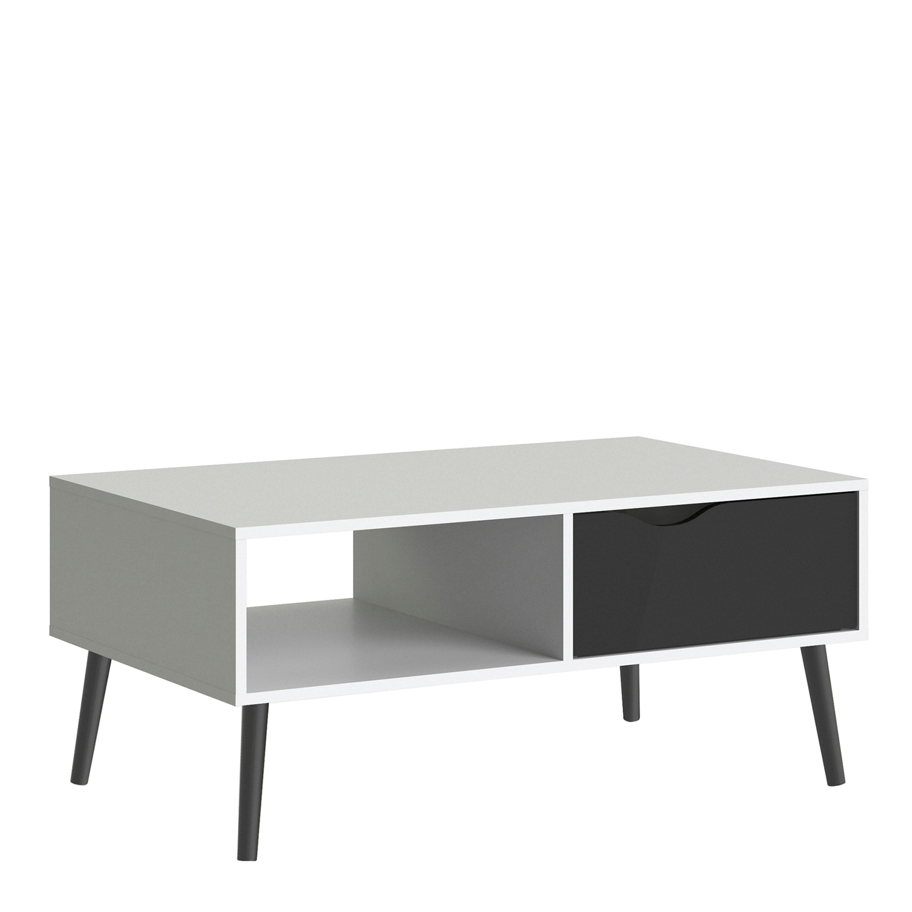 Rackhams Oslo 1 Drawer 1 Shelf in White and Black Matt - White and Black - White - 60.2from £125.95 up to £149.99 Compare prices2→Bringing a retro-modern note to the living room, the Furniture To Go Oslo coffee table pairs Scandinavian-inspired style with a crisp white and black matt finish. Designed to sit neatly in front of yo more→ur seating, it offers a considered balance of display and storage for everyday lounging. Part of the Oslo collection, this coffee table features a practical combination of 1 drawer and 1 shelf, keeping essentials close to hand while leaving space to style books and decorative pieces. The clean-lined look and contrasting tones make it an easy match for contemporary interiors, while the streamlined storage helps maintain a calm, uncluttered feel. Key features Oslo coffee table from Furniture To …
