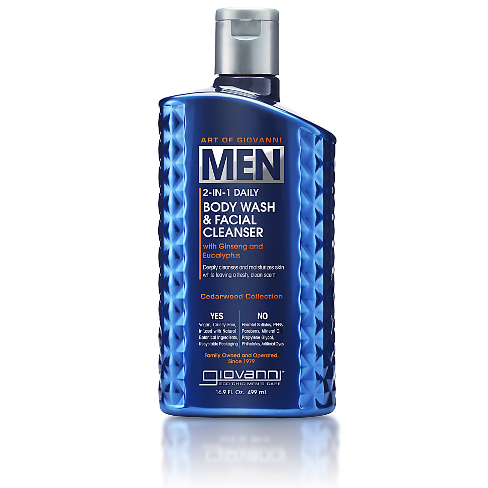 Giovanni Men 2-1 Body Wash and Facial Cleanser GVMN21BDYWSHFCILfrom £9.88 up to £54.00 Compare prices5→Designed specifically for men, this dual-purpose body and face wash from Giovanni effectively cleanses away dirt, sweat, residues, and excess oils while moisturising the skin. Infused with extracts of more→Cedarwood, Lemongrass, Saw Palmetto, Nettle, Aloe Vera, Clary Sage, and Ginseng, it leaves skin feeling refreshed, renewed, and hydrated. Enjoy healthy-looking skin with a fresh, clean scent that lasts all day. With Ginseng and Eucalyptus Deeply cleanses and moisturises Leaves skin feeling fresh and hydrated Laureth sulfate-free Suitable for Vegans How to use: Apply onto a wet washcloth, loofah, or sponge, or directly onto wet skin; create a lather and apply to body or face. Rinse off thoroughly …
