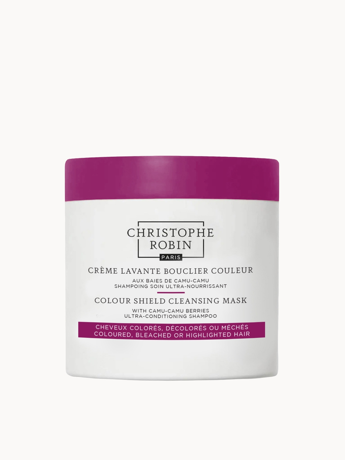 Shield Christophe Robin Colour Cleansing Mask 250ml NEWCC250from £14.80 up to £34.18 Compare prices4→The Colour Shield Cleansing Mask from Christophe Robin is a gentle, low-foaming shampoo designed to be applied as a weekly deep treatment to extend the life of colour-treated hair.Enriched with camu c more→amu berries, a rich natural concentrate of vitamin C, the formula protects hair while boosting hydration and shine. The pearlescent, ultra-conditioning formula respects hair's natural oils, leaving it feeling nourished with glossy radiance.