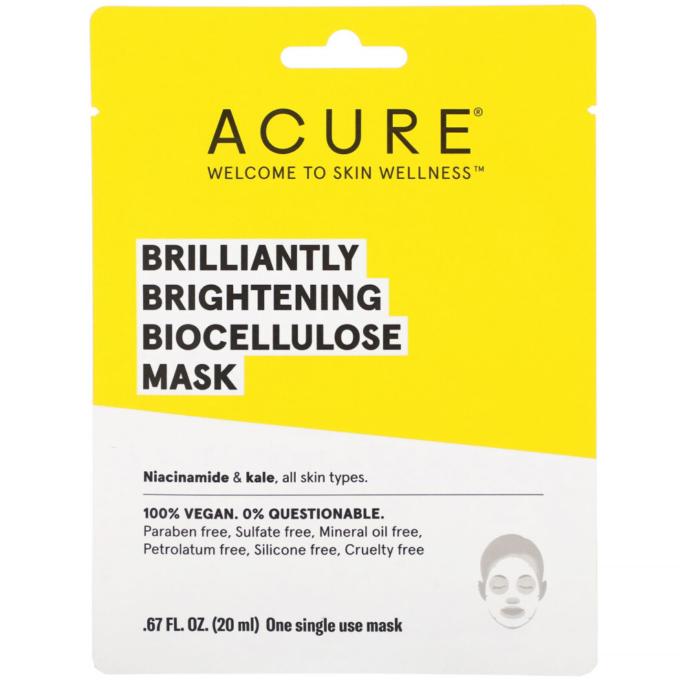 Acure , Brilliantly Brightening, Biocellulose Mask, 1 Single Use Mask13.39Buy!£OnBuy.comDelivery: in United Kingdom ReportDescription Welcome to Skin Wellness Niacinamide & Kale, All Skin Types. 100% Vegan. 0% Questionable. Paraben Free, Sulfate Free,