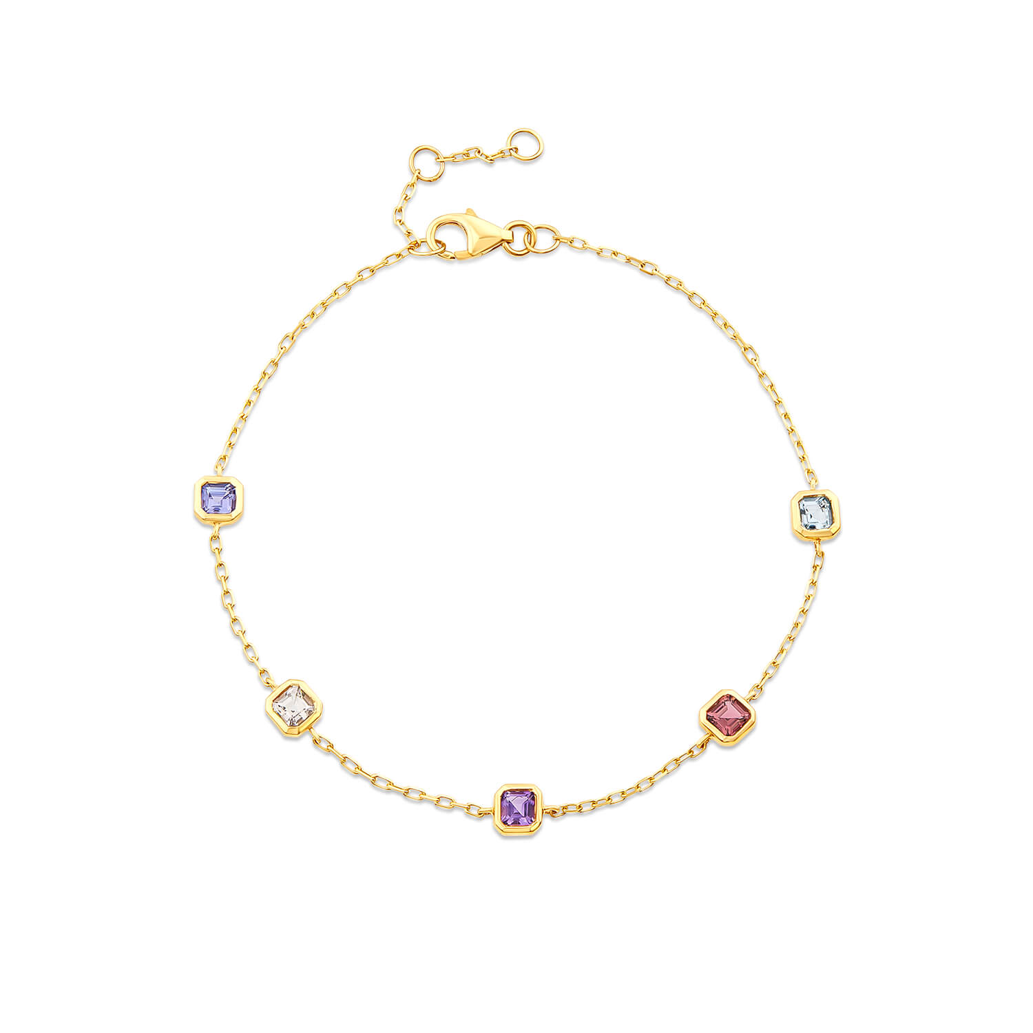 9ct Gold Multi Colour Five Stones Chain Bracelet Ladies875.00Buy!£Fraserhart.co.ukDelivery: in United Kingdom ReportThis 9ct yellow gold bracelet features five 3mm stones — amethyst, morganite, aquamarine, pink tourmaline, and tanzanite — spaced evenly along a fine chain for a light, colourful look that’s easy to w more→ear every day.